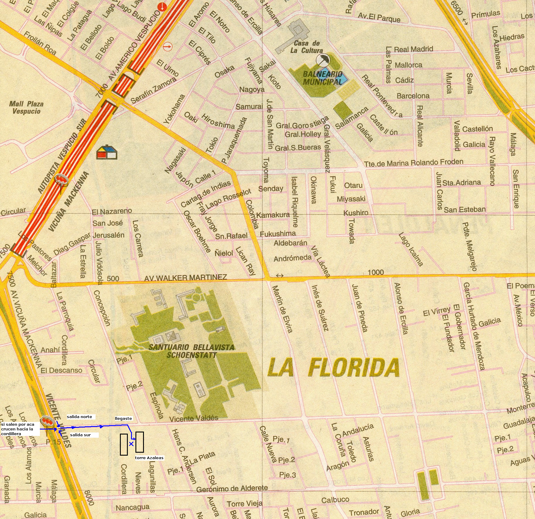Si vienen por Vicuña, pasen de largo el cruce de Vespucio (paradero 14 de Vicuña Mackenna) y el siguiente semáforo (que es Vicente Valdes) también, ya que allí no pueden doblar hacia la cordillera así que sigan hasta el siguente, que es Gerónimo de Alderete y doblen hacia la cordillera (hacia la izquierda), luego doblen nuevamente a la izquierda en la 2da calle (está justo antes del semáforo, pasa desapercibida y tiene un lomo de toro oculto como recibimiento, asi que si pasan el semáforo, sigan derecho hasta Colombia). Siguiendo por Hans C. Andersen, que es estrecha y llega a Vicente Valdes y nuevamente doblan a la izquierda (hacia la costa) y llegarán casi altiro a las torres.