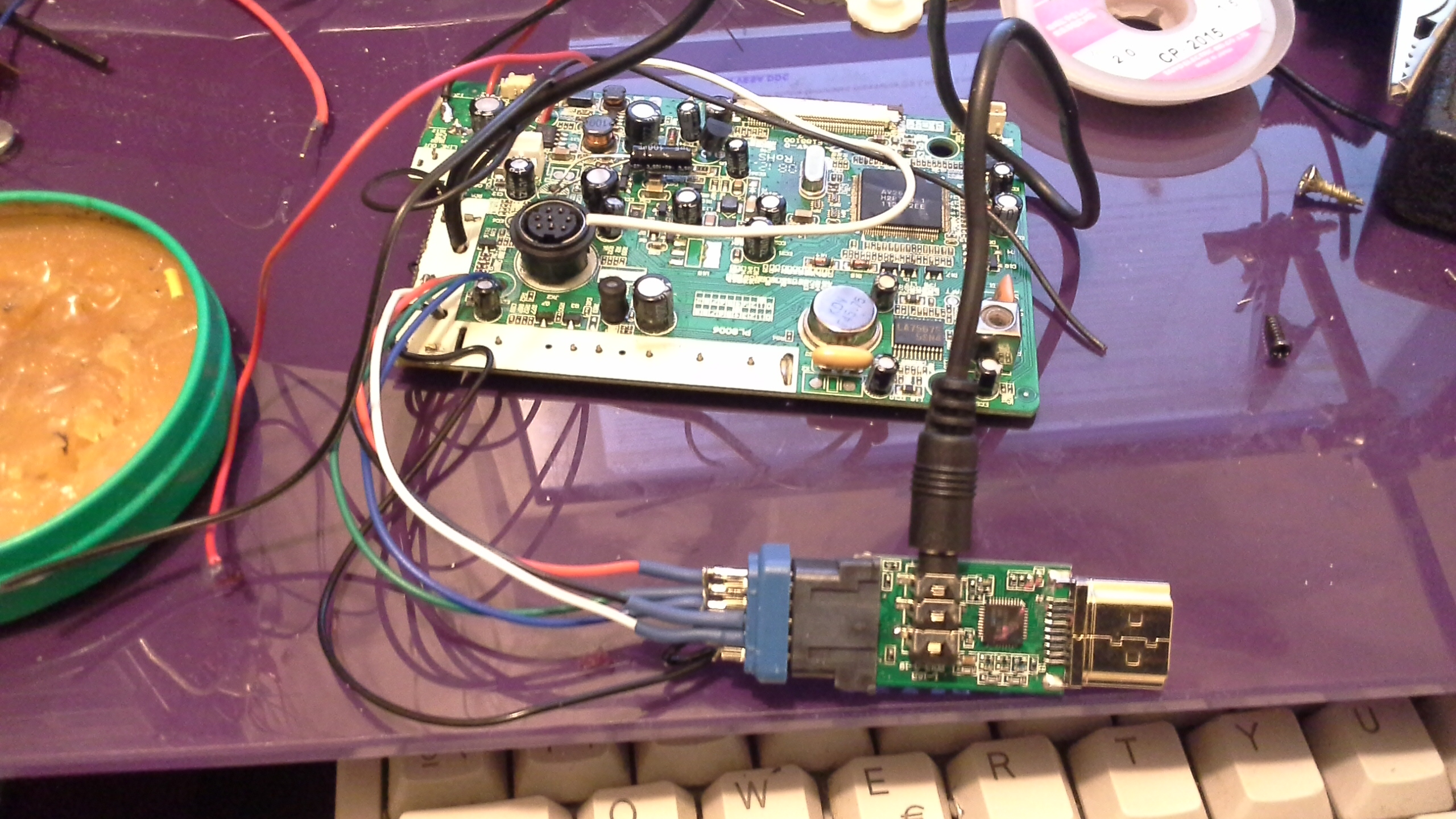 Soldando señales.... en este caso vga... afortunadamente la placa controladora del tv/lcd de 8 oulgadas tiene los test pads de casi todas sus señales asi que soldar los cablecitos no sera problema...