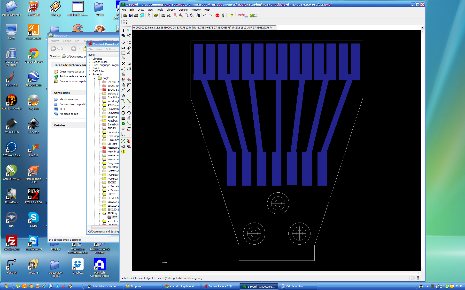 Llegué a una versión estable del SDRIVE en pcb de doble faz... y descrubrí como hacer agregaciones de un mismo pcb a la vez en Eagle... y así fresar o mandar a fabricar varias placas de una sola vez... como si de un proceso en serie se tratase... Para ello hay que cerrar el editor de circuitos esquemáticos para que el editor del pcb te permita copiar pegar el diseño de la placa... (sino se cierra el otro editor te arroja un cuek :) ). Esto genera una inconsistencia entre esquemático y pcb (al haber elementos de pcb sin hermano en el editor de esquemáticos)... pero antes, grabas todo con otro nombre para no alterar el diseño estable y con coherencia, y procedes como indico...