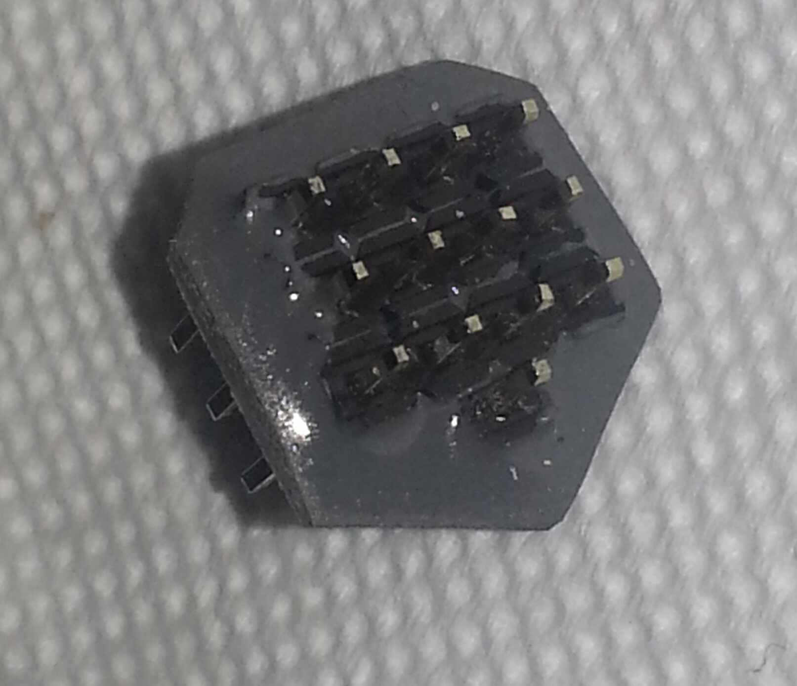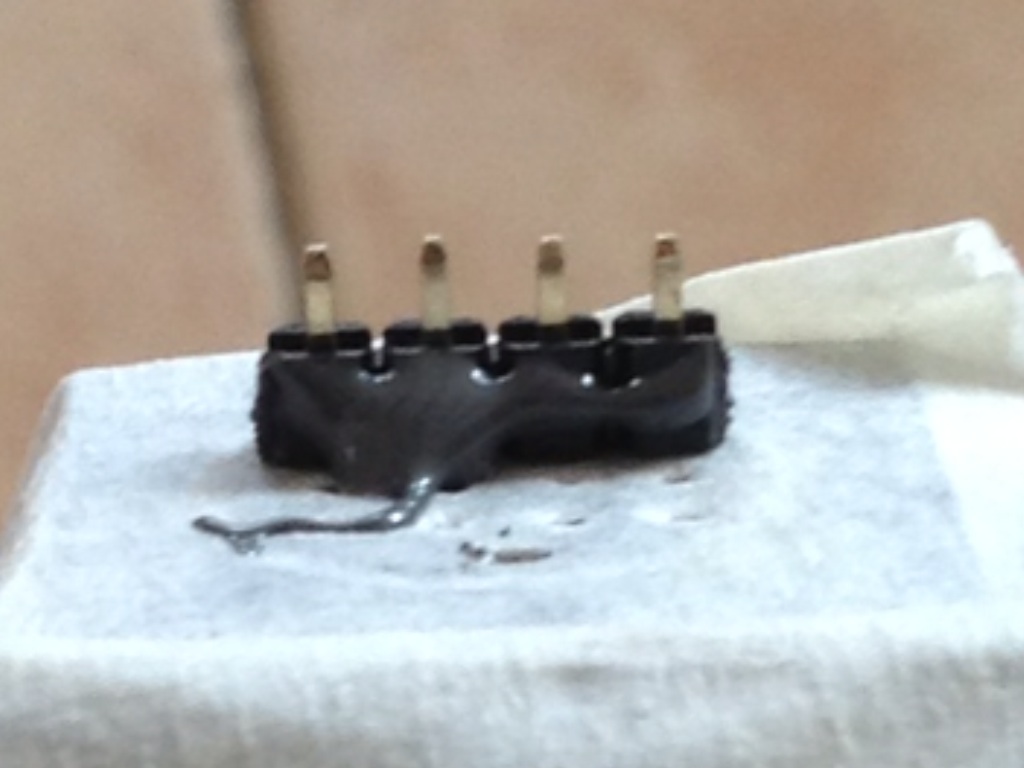 Ahora insertamos los pinheads en el conector hembra DIN13 colocando epoxy entre medio atravesando la huincha con los pinheads, y así usar el conector hembra como base de fijación del conector macho que esta en construcción.