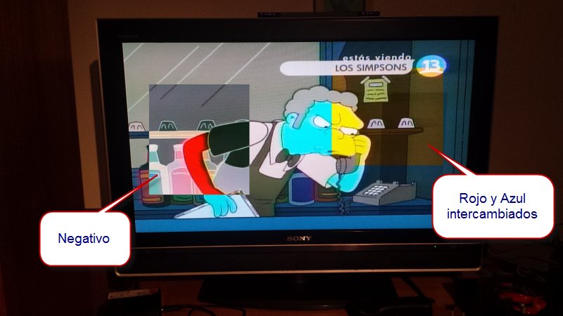 Los cuadros que superpuse corresponden a poner la imagen en negativo y al intercambio de canales azul y rojo, manteniendo el verde intacto.