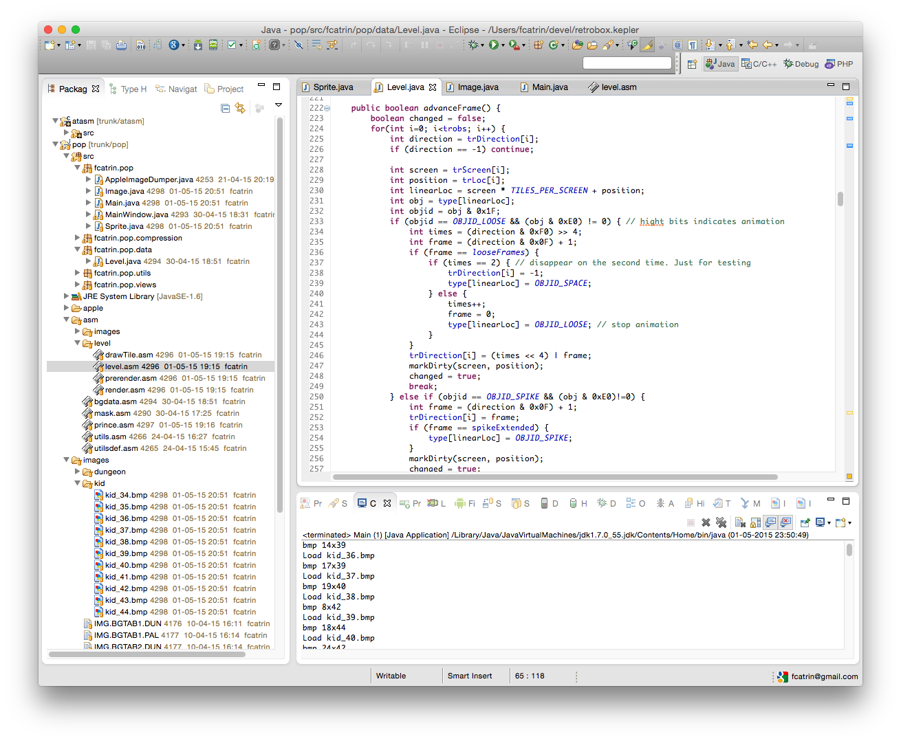 Mi estrategia se basa en un pequeño módulo de emulación del video del Atari en Java. Es aquí en donde hago las pruebas de los algoritmos, la interpretación de los datos, etc. Esto me permite avanzar MUY rápido ya que tengo debugger, el código es más o menos de alto nivel de abstracción y puedo rápidamente hacer modificaciones e ir empapándome con la forma en que funciona PoP. Para tener una idea, creo que estaba renderizando los gráficos del juego al segundo o tercer día de trabajo. Con todos los cambios que hice, hacer lo mismo programando en ASM del 6502 me hubiese tomado más de una semana como mínimo.