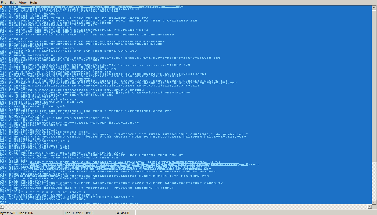 vitoco escribió:SITRE evolucionó para soportar más de 4 bancos de 16K, permitiendo grabar desde 1 hasta 17 bancos dependiendo del tipo de expansión de memoria reconocido entre 130XE, 800XL con Buchholz, Rambo/XL, Rambo320K, Newell, Newell modificado e incluso ninguna. Esto es, desde 16K hasta 208K!!!
