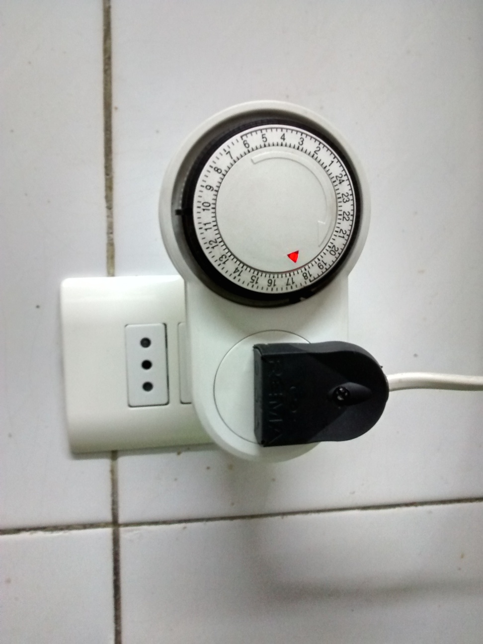 Para controlar la válvula uso un timer sencillo para artefactos de 220V, $2500 gracias a los chinos: La válvula se conecta directamente al timer como si fuera una lámpara, así de simple. Si quisiera ponerme pituco podría cambiar el timer por uno con pantalla digital que me daría un control más fino y exacto sobre los tiempos y días de riego (y el cambio sería literalmente plug & play) pero para los escasos requerimientos de mi jardín el timer electromecánico hace la pega perfectamente.